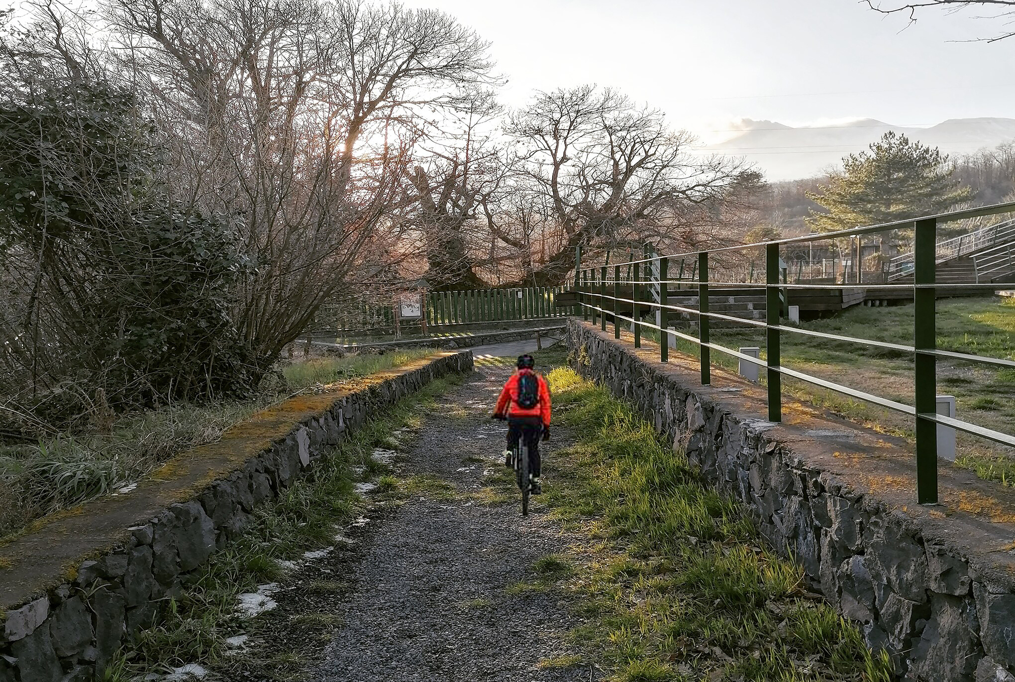 - Nella splendida cornice del Castagno dei Cento Cavalli (Sant’Alfio), un sentiero si snoda tra la natura incontaminata dell’Etna e l’umano. La foto simboleggia le potenzialità di un giro in bici nell’ottica di un trasporto sostenibile, in cui la lentezza permette di assaporare i dettagli di cui spesso la velocità e la quotidianità ci privano. Il ciclista è metafora della dicotomia presente in ogni uomo, in equilibrio tra le manifestazioni interiori ed esteriori dell’anima, e perennemente in cammino.