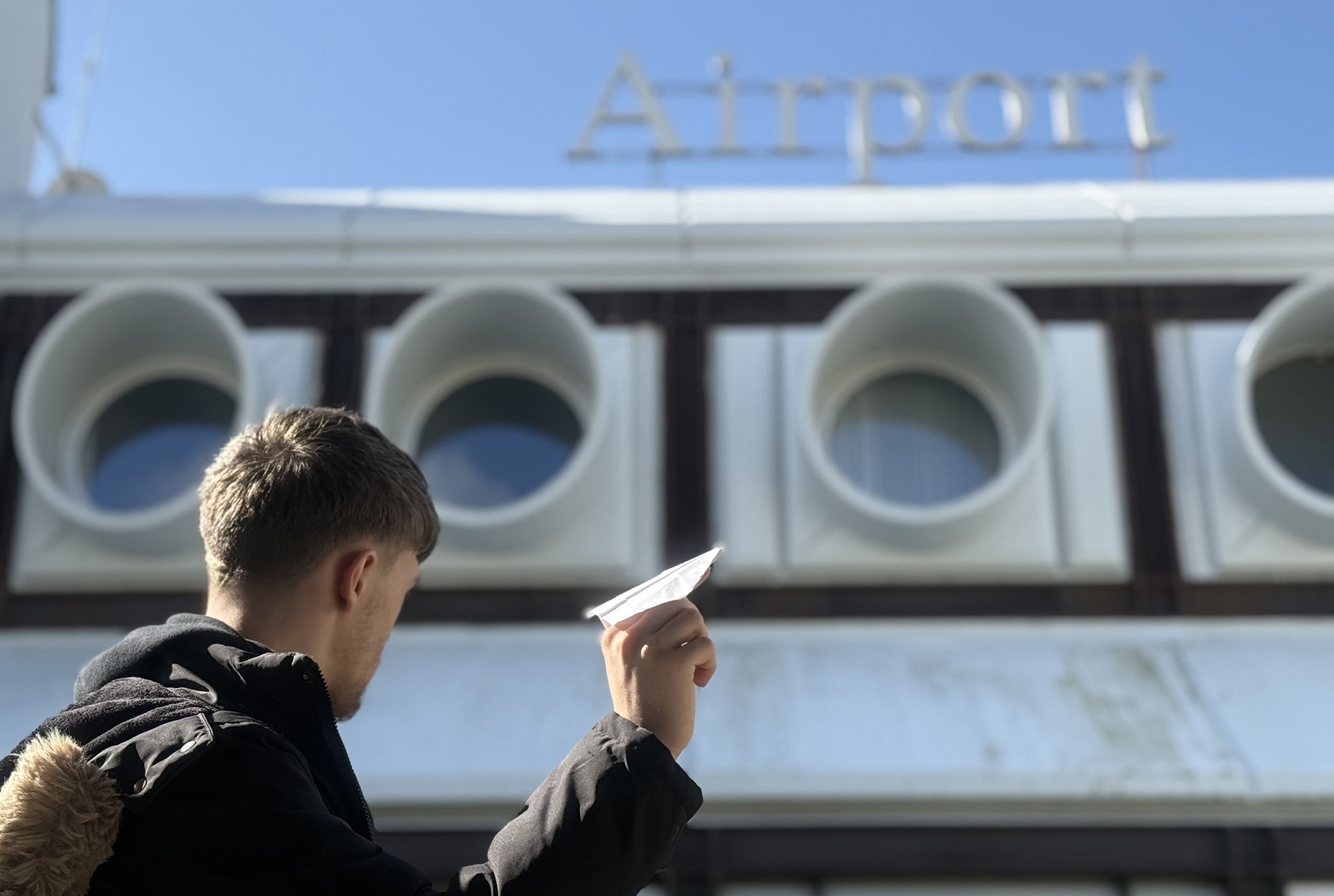 Nella foto c'è un ragazzo che tiene un aeroplano di carta vicino alla scritta "Airport". Questa foto rappresenta l'idea di sogni e il desiderio di volare.