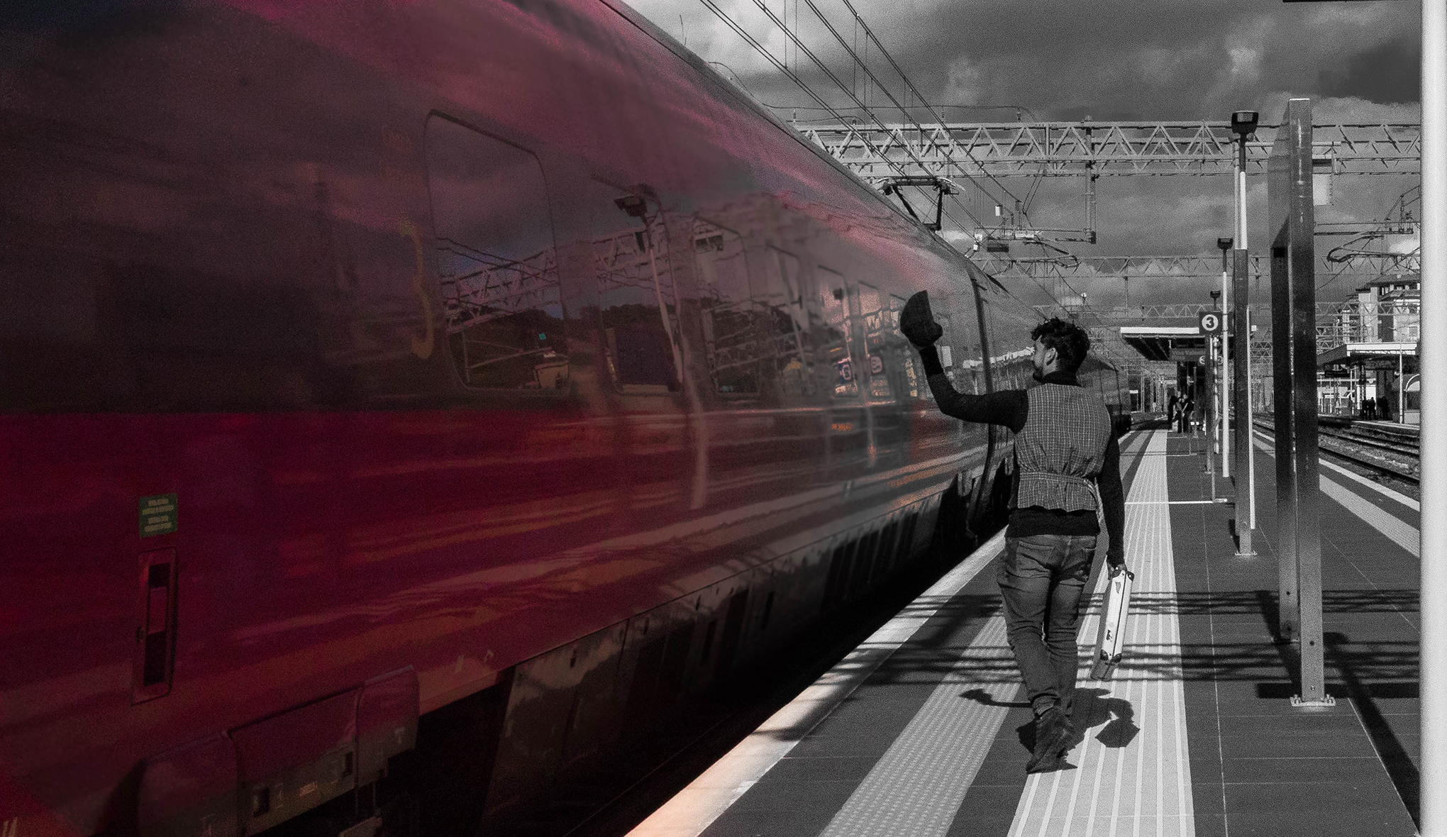 Rappresentazione delle ferrovie della Calabria, divise in due. Da una parte la Tirrenica con l'alta velocità rappresentata dal treno rosso Italo, dall'altra la Ionica che ancora è indietro per questo è in scala di grigi e con l'abbigliamento anni '50.