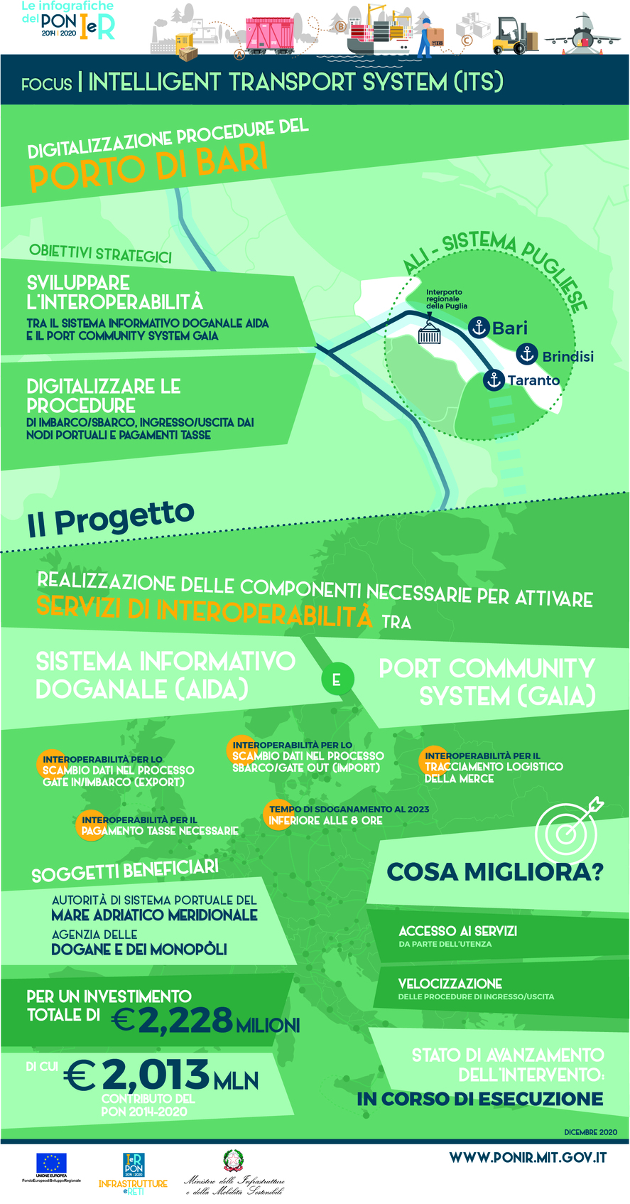 Incontro con gli studenti. I ragazzi sono stati accolti presso l’auditorium del Terminal Crociere del Porto di Bari, dove il Presidente dell’Autorità di Sistema Portuale del Mar Adriatico Meridionale, Ugo Patroni Griffi, ha introdotto la mattinata spiegando ai ragazzi le principali caratteristiche del Porto di Bari e i progetti innovativi in atto. Dopo la presentazione della giornata, i ragazzi sono stati condotti nel mondo del PON-IR e dell'Europa grazie ad un formatore/animatore esperto nella divulgazione di temi complessi alle giovani generazioni. In questa prima fase i ragazzi hanno potuto esprimersi sul significato di essere cittadini europei e hanno potuto comprendere il ruolo del Programma nel loro territorio. È stato poi illustrato ai ragazzi il Contest creativo che li vedrà coinvolti nelle settimane a seguire. A seguire l’Ing. Mario Mega, dell’AdSP Mar Adriatico Meridionale, entra nel dettaglio dell’intervento finanziato dal PON-IR, sulla digitalizzazione delle procedure del Porto di Bari, spiegando come funzionano il Sistema Gaia e Aida e quali benefici apporteranno alle dinamiche lavorative dell’hub pugliese.