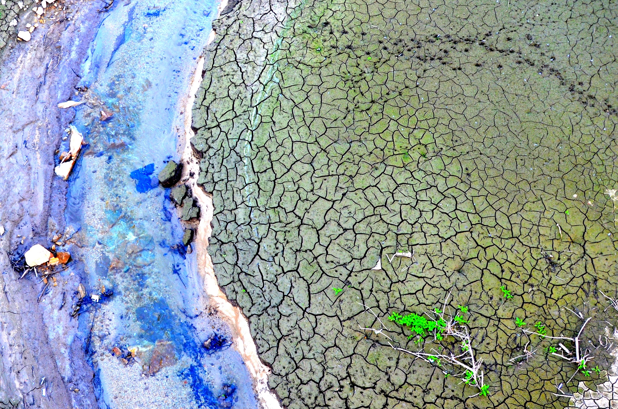 Ritraendo solo una piccola porzione, la foto vuole mettere in evidenza da un lato la terra riarsa dal sole e spaccata per il perdurare di siccità anomale, ma nello stesso tempo, la forza dell’acqua che si fa strada e che, al suo passaggio, è pronta a lasciare la sua impronta.