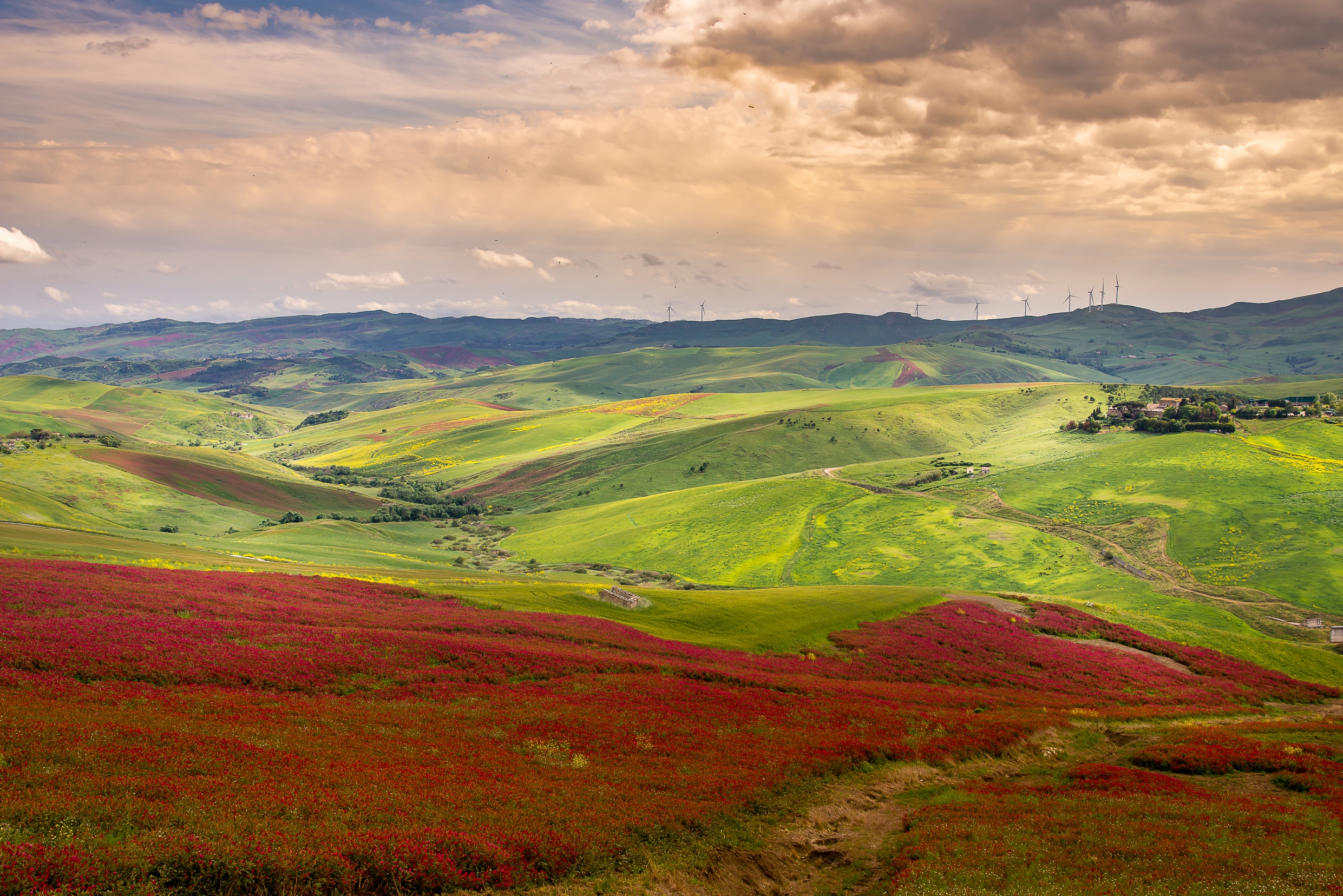 • Questa foto cattura la bellezza di una scena rurale dove campi coltivati si alternano con parchi eolici, offrendo un'immagine suggestiva di sostenibilità ambientale e uso di energie rinnovabili. I campi coltivati rappresentano la produzione sostenibile di cibo, mentre i parchi eolici simboleggiano l'utilizzo dell'energia eolica pulita per generare elettricità, riducendo l'impatto ambientale rispetto alle fonti di energia tradizionali. Questa combinazione illustra un futuro in cui la natura e l'uomo lavorano insieme per preservare il pianeta e garantire un approvvigionamento energetico sostenibile.