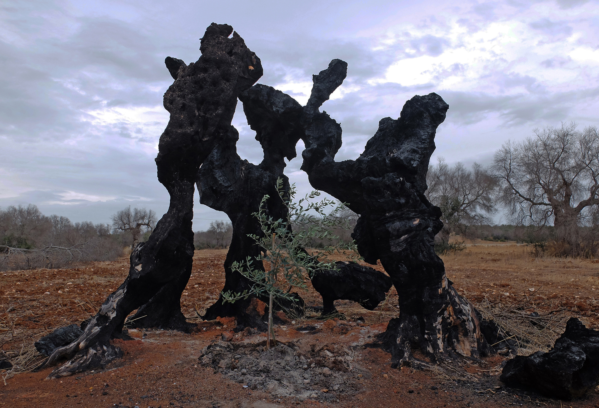 • Nel sud Italia un batterio denominato Xylelle in pochi anni ha devastato il territorio del Salento provocando la morte di milioni di alberi di ulivo; una sciagura economica, paesaggistica e culturale senza precedenti. Magnifici alberi secolari che in seguito, complice l'inevitabile abbandono, sono stati facile preda del fuoco. Giuseppe, Pippi, ha novant'anni e ha ereditato un fazzoletto di terra sul quale crescevano rigogliosi 12 maestosi ulivi, anch'essi irrimediabilmente andati in fumo. Pippi però non si è arreso e, caparbiamente, ha reagito reimpiantandone di nuovi e più resistenti alberelli, esattamente dove si ergono le sagome spettrali delle vecchie piante, consapevole che con l'avanzare degli anni difficilmente avrebbe goduto dei loro frutti e della loro ombra. Un piccolo gesto poetico il suo, di speranza e rinascita.
