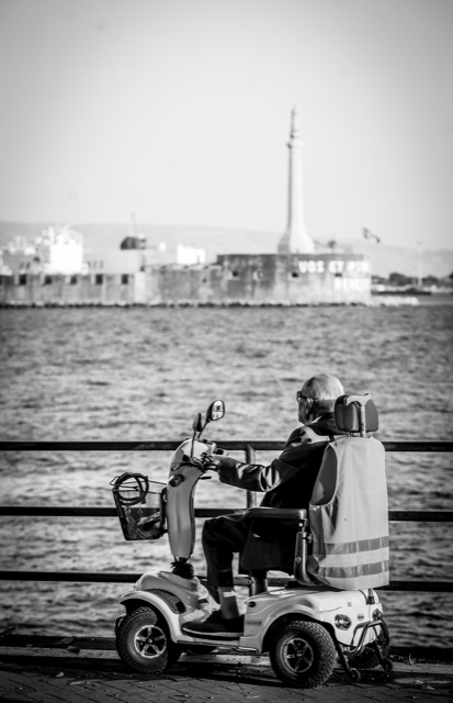 • L’uomo, il tempo e la città. Un uomo e il tempo che scorre. Ricordi passati, barriere architettoniche abbattute negli anni, mezzi sempre più moderni che agevolano la mobilità. Lo sguardo è rivolto allo stretto di Messina quasi ad ammirare un Ponte che in realtà non c’è. L’uomo e il rapporto con le infrastrutture e con tutto quello che burocraticamente non cambia. In antitesi passato e presente, cosa è rimasto uguale, cosa vorremmo cambiare e cosa cambierà. La speranza del futuro e la voglia di vedere ancora qualsiasi sorte di cambiamento che fa sentire l’essere umano sempre più vivo.